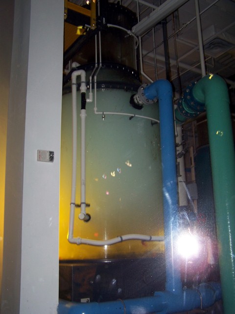 Next is the impressive “Systems Control” room occupied by an imposing two-story skimmer. The aquarium maintains a total of 1.4 million gallons of water and must circulate 11,664,000 gallons of water every day in the shark lagoon alone.